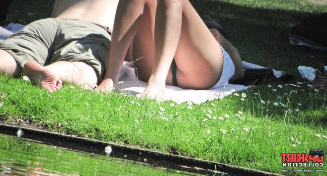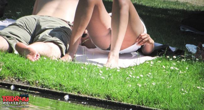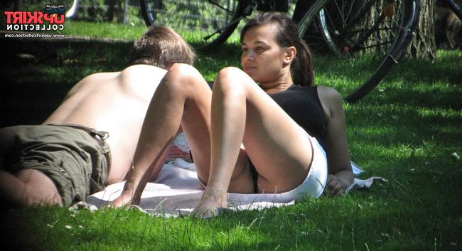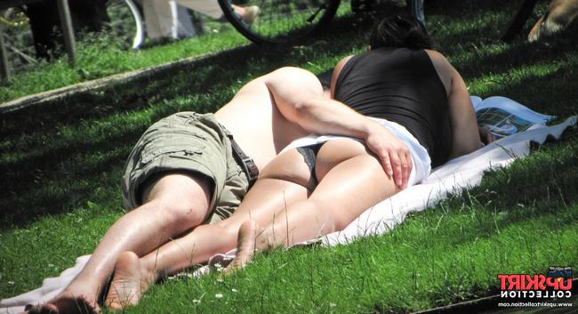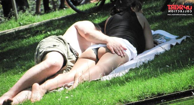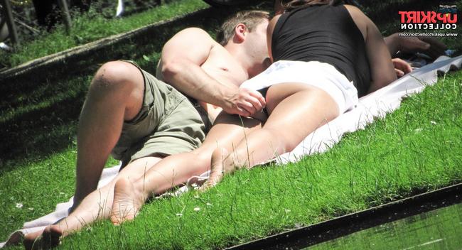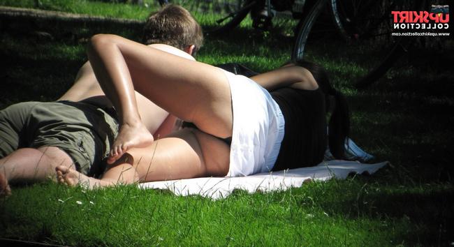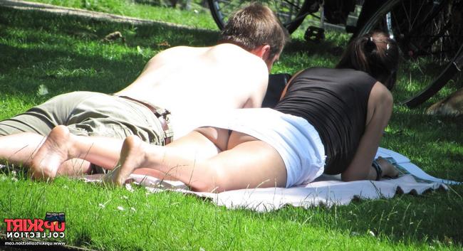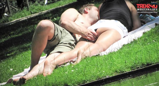 .Парень с девушкой лежат на травке и загорают.Девушка в короткой юбке из-под которой виднеются маленькие,черные трусики целует парня.Паренек заводится и ласкает мокрую,горячую дырку своей подружки под юбкой.
