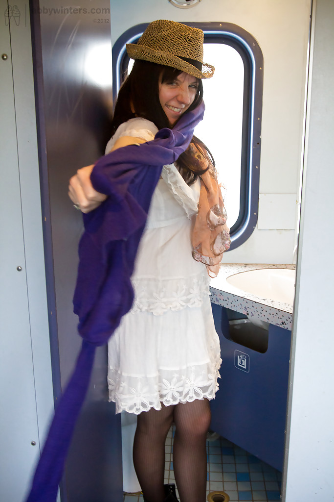 Симпатичная девушка отправилась на поезде в соседний город, чтоб развлечься. Во время поездки милашке понравился мачо, который сидел напротив, и она начала его соблазнять. Телка сначала показала парню трусики, а затем отправилась в туалет, где сняла белье и, вернувшись на место, принялась ласкать пилотку пальчиками.
