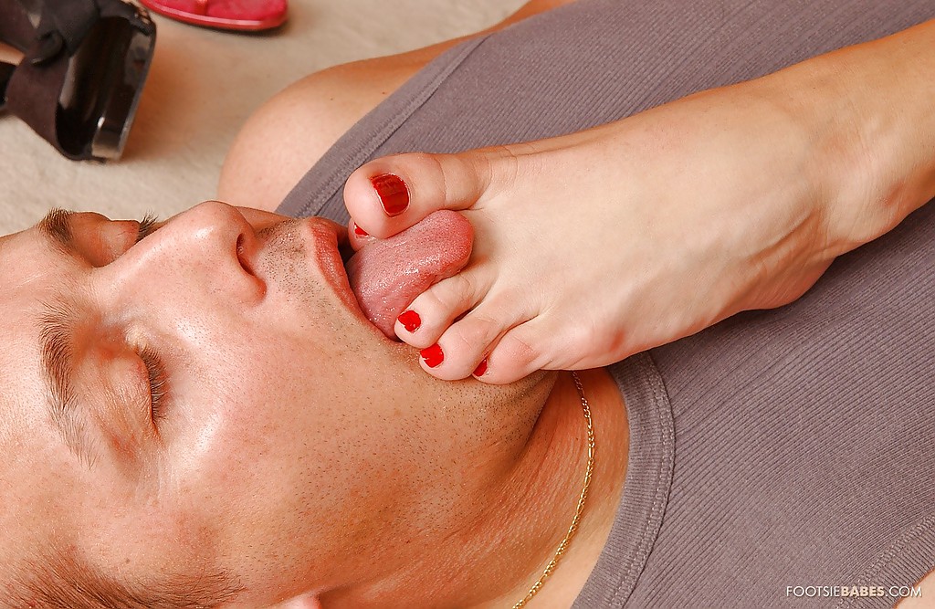 Стройная фетишистка встретила возлюбленного в нижнем белье и, расположившись с ним на полу возле входной двери, подставляла ступни, чтобы он их расцеловывал. Затем милашка начала ласкать пенис суженного ногами. Возбудившись до предела, кавалер вогнал стоячий член в киску соблазнительницы и активно трахнул.